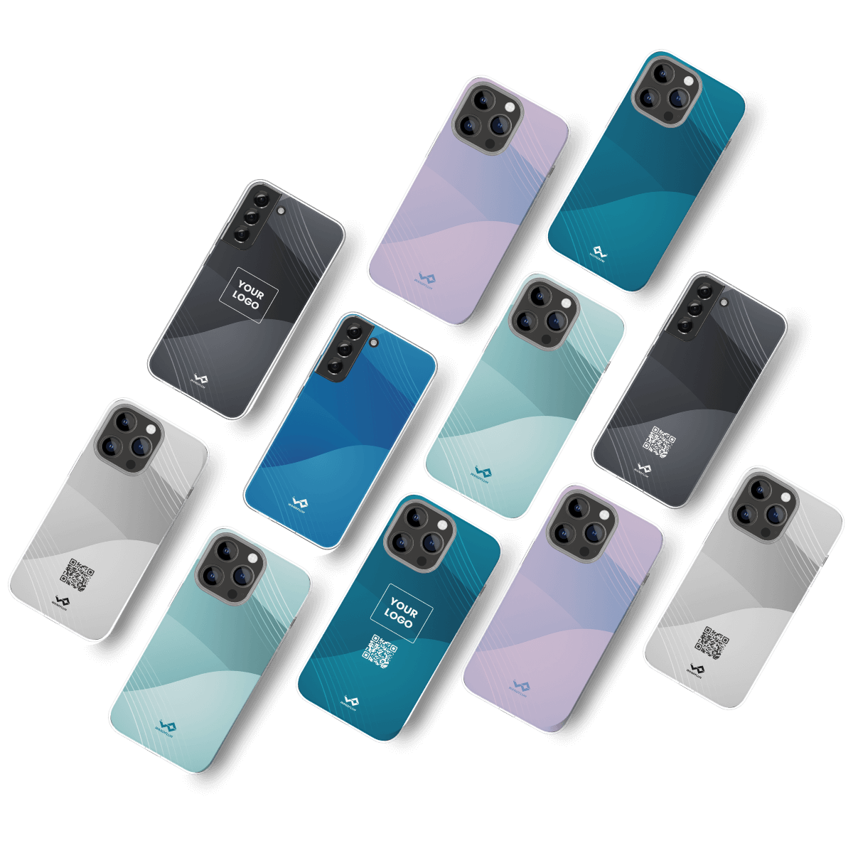 Scegli la grafica della cover, il modello del tuo smartphone e, se desideri, aggiungi il tuo logo e un QR code personale.